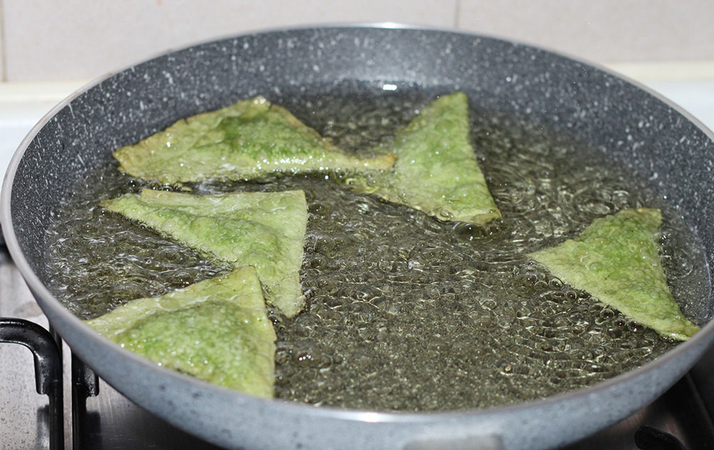 English. Fry the samosas in hot peanuts oil, three minutes per each side. Use a generous quantity of oil, in order to get crunchy and dry samosas. A well cooked “green samosa” has some little bubbles on the surface while the colors fades a bit out.