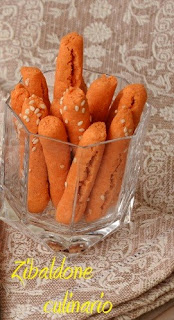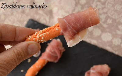 Formare dei filoncini dello spessore di circa 1cm e della lunghezza di 10cm, pennellare con olio evo e rotolarli nel sesamo.