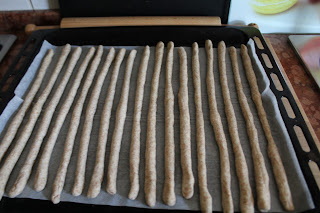 Disporre i grissini sulla teglia foderata con carta forno, distanziandoli appena.