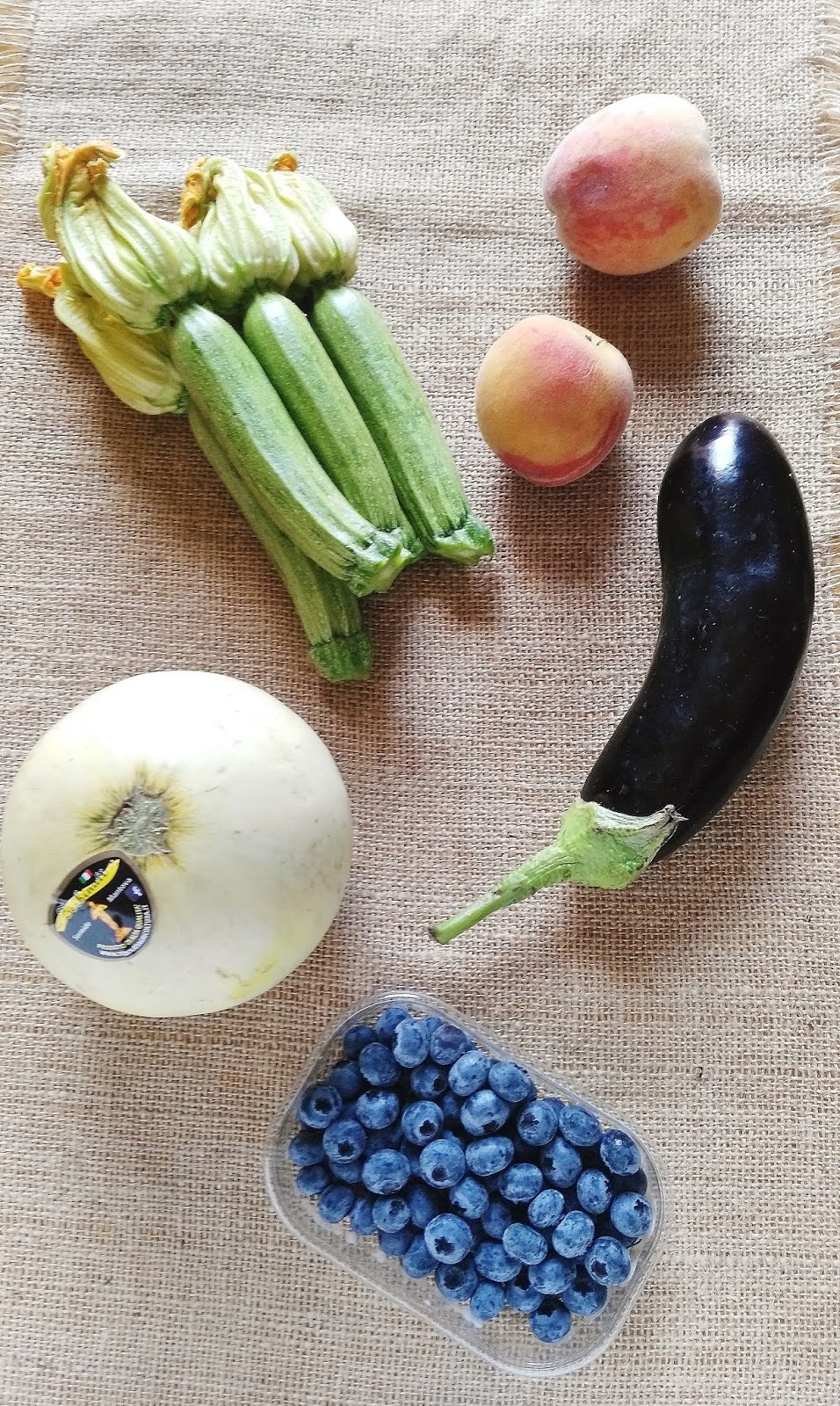 Oggi, al Mercato di Piazza Scio, ho trovato delle magnifiche Zucchine di Arenzano, Melanzane del Ponente Ligure, Melone Mantovano, Pesche di Volpedo (provincia di Alessandria) e i miei amatissimi Mirtilli.