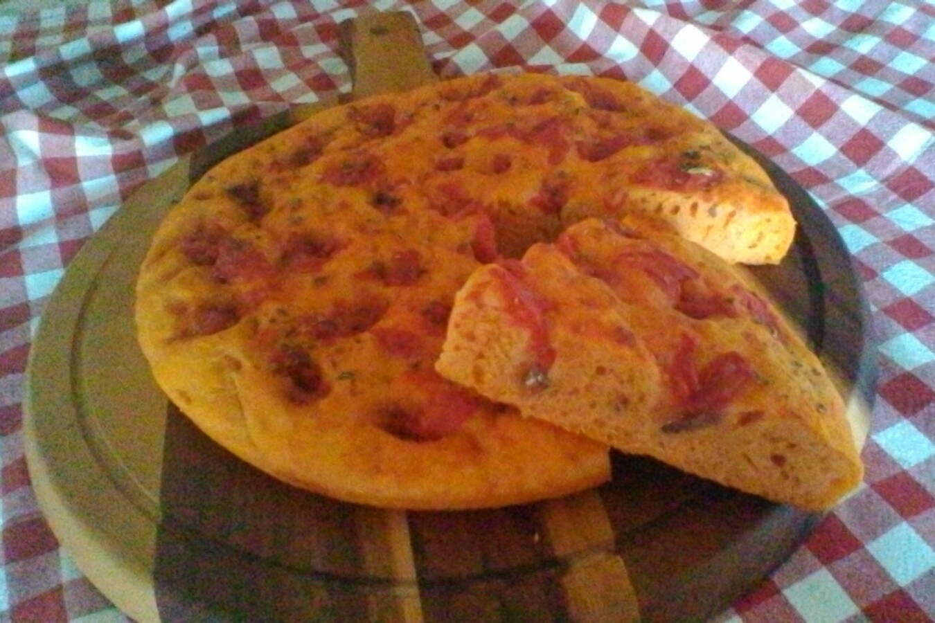 Dopo aver sciolto il lievito di birra in acqua tiepida mescolatelo con il peperoncino (vi consiglio di non esagerare con il piccante, io 1/2 cucchiaino di piccante e 1 di dolce ) e lo spicchio d’aglio tritato. Unite pian piano la farina, l’olio, il sale e una metà dei pelati precedentemente schiacciati. La pasta diventerà “arrussicata”, ossia tendente al rosso, impastate fino ad ottenere un impasto consistente ma leggermente appiccicoso. Lasciate lievitare fino al raddoppio.