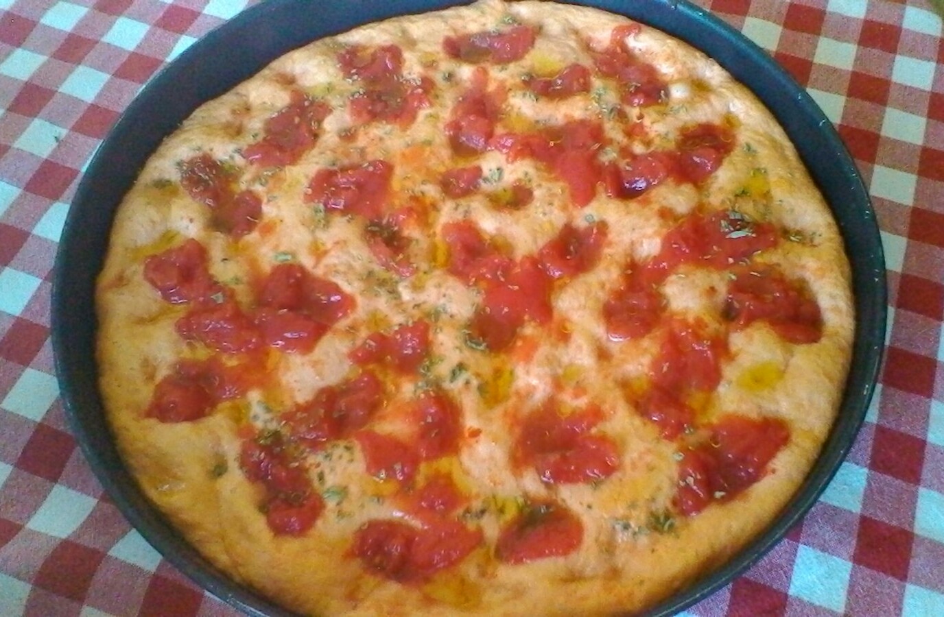 Rimpastate e con le mani unte d’olio stendete l’impasto grossolanamente in una teglia unta. Guarnite con i restanti pomodori pelati che affonderete dentro l’impasto formando dei buchi, da noi grupi; allo stesso modo procedete con le alici sott’olio. Spolverate la superficie con l’origano e un filo d’olio evo.