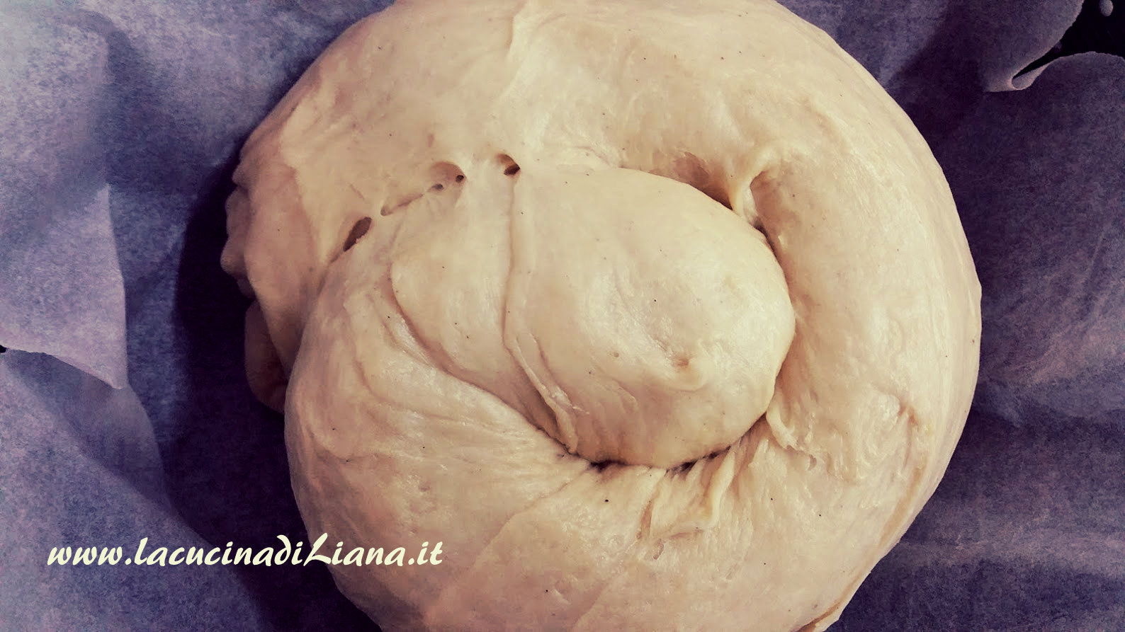 Riprendere la pasta e stenderla in un rettangolo sottile, spalmare sopra l’impasto con l’aiuto di un cucchiaio, quindi arrotolare dal lato lungo, e poi avvolgere a spirale il rotolo, riporlo nello stampo rivestito di carta forno, e porlo a lievitare al caldo per circa 2 ore.
