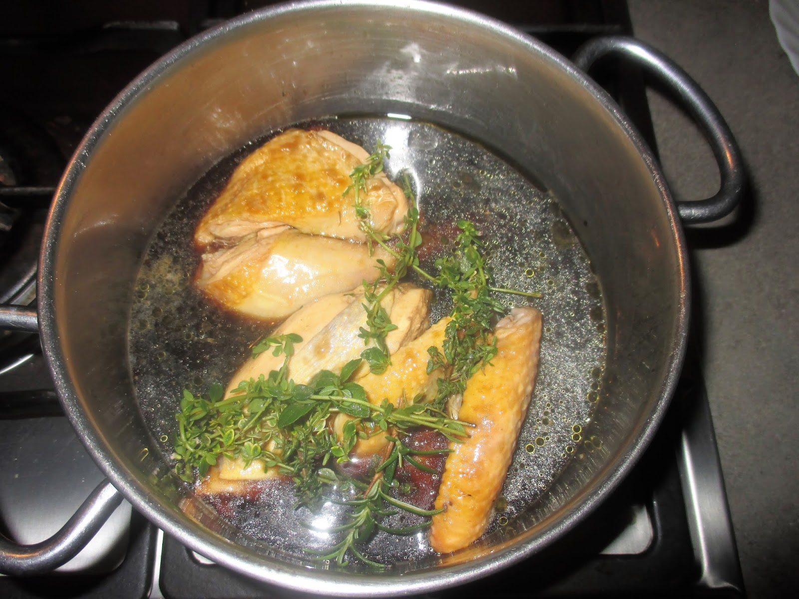 After the marinating time, take a pot that goes well for the oven. Take a fried with oil and shallots. well browned guinea fowl, then add half of the liquid marinade and bake in a 180 degree oven for about 60/70 minutes.