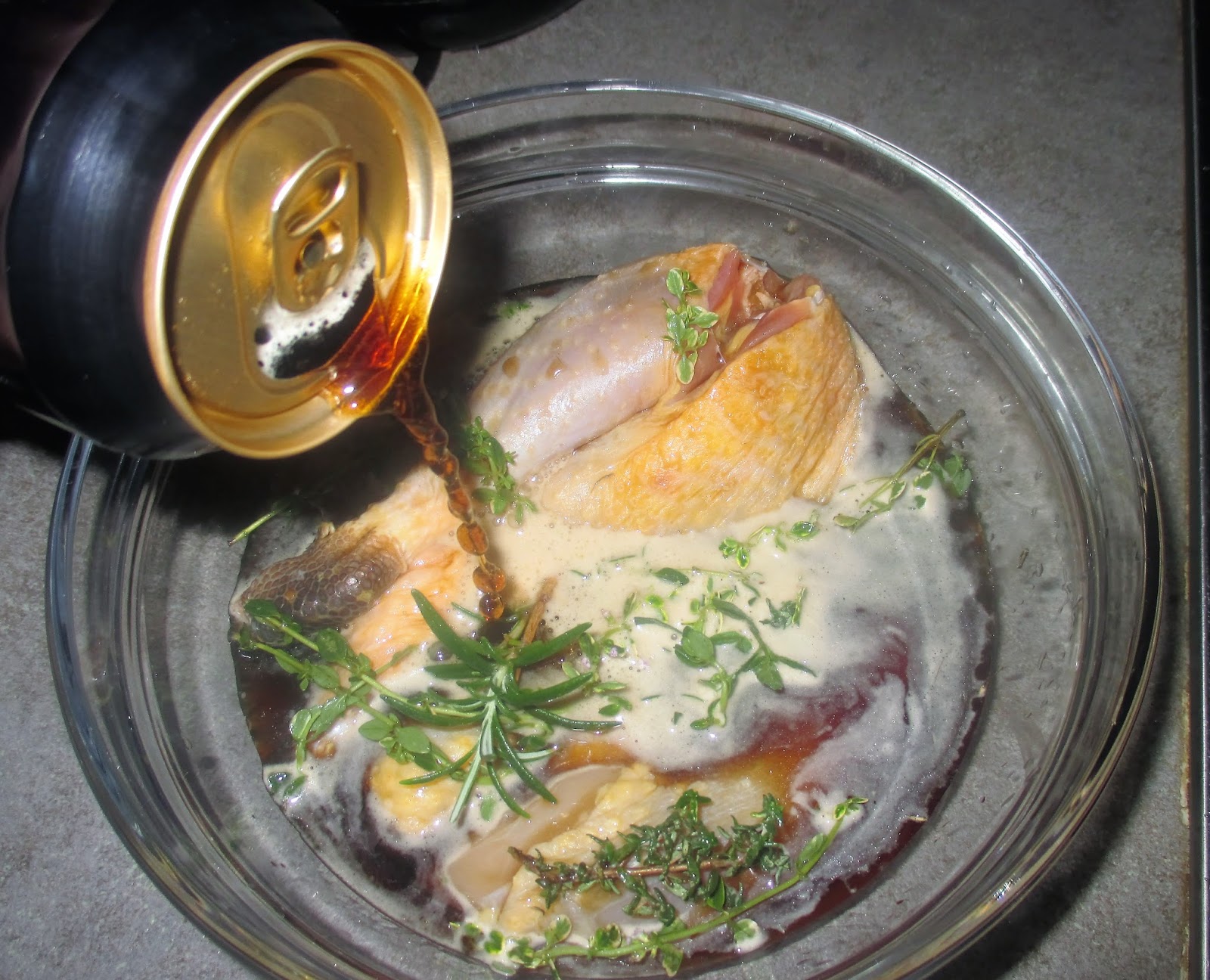 Dans un assez grand récipient, place à l’intérieur des pièces de Guinée volaille bien lavé et séché. épices Unies, le gingembre râpé, les baies de genièvre, et une pinte de bière. Fermer le couvercle et laisser mariner pendant au moins 4 heures.