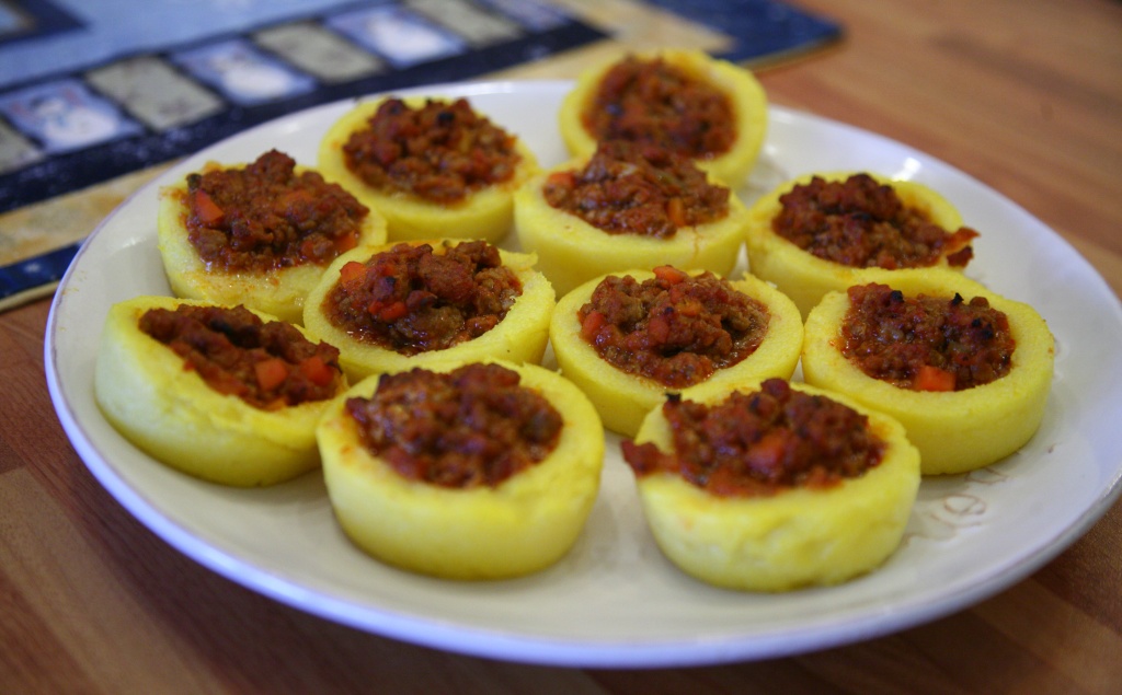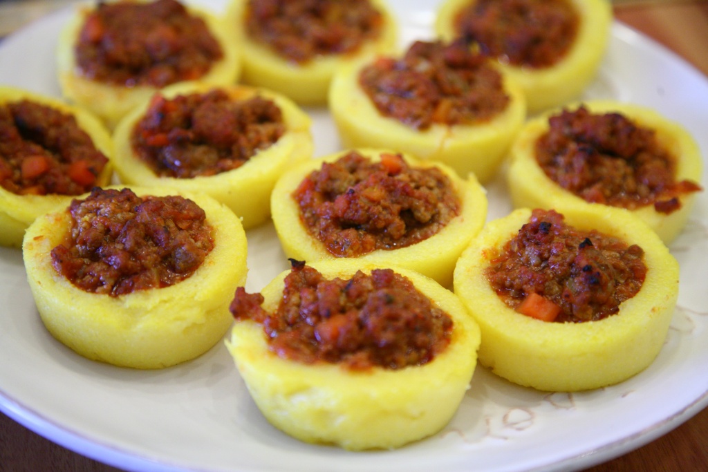 Prendere i muffin di polenta e scavare per creare la forma dei vol au vent e riempire con il ragù.