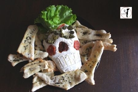 Halloween: teschio di formaggio con cracker di pasta matta e semi di sesamo in friggitrice ad aria