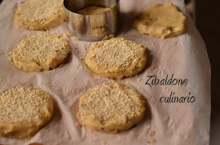 Stendere un foglio di carta forno ed inumidirlo con acqua, bagnarsi le mani e dividere l’impasto in 8 porzioni. Prendere un coppapasta bagnarlo, posizionarlo sulla carta forno e all’interno mettere l’impasto. Livellarlo con le mani. cospargere la superficie di semi di sesamo.