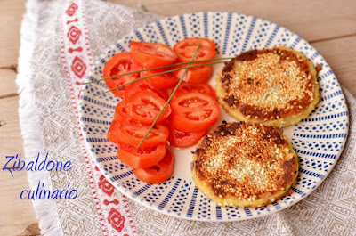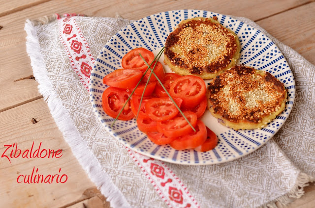 Stendere un foglio di carta forno ed inumidirlo con acqua, bagnarsi le mani e dividere l’impasto in 8 porzioni. Prendere un coppapasta bagnarlo, posizionarlo sulla carta forno e all’interno mettere l’impasto. Livellarlo con le mani. cospargere la superficie di semi di sesamo.