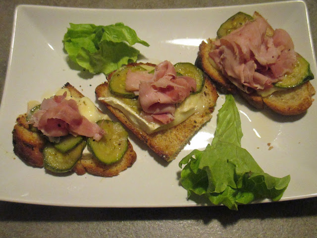 Toast the bread in the oven at 220 degrees for 10/15 minutes. Saute the ham in a pan, then take the bread slices and put on the camembert, ham and zucchini. Transferred all in a pan, cover and cook long enough to melt the cheese. Serve hot