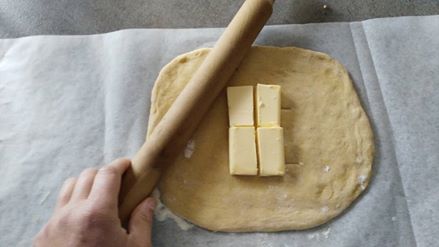 Perhaps the most complex but with a little patience you run quietly. Take the dough from the refrigerator and roll it out with a rolling pin to form a square. Within the same 120 grams of softened butter. Take now the four sides of the dough and close it all taking so inside the butter as seen in photos.
