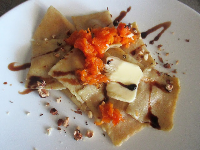 Homemade ravioli in the mix where I also added turmeric powder and oregano Sicilian. The filling is a classic mixture of pumpkin, parmesan cheese and bread crumbs. The crispy part is given by the hazelnuts and vinegar Balsamic.