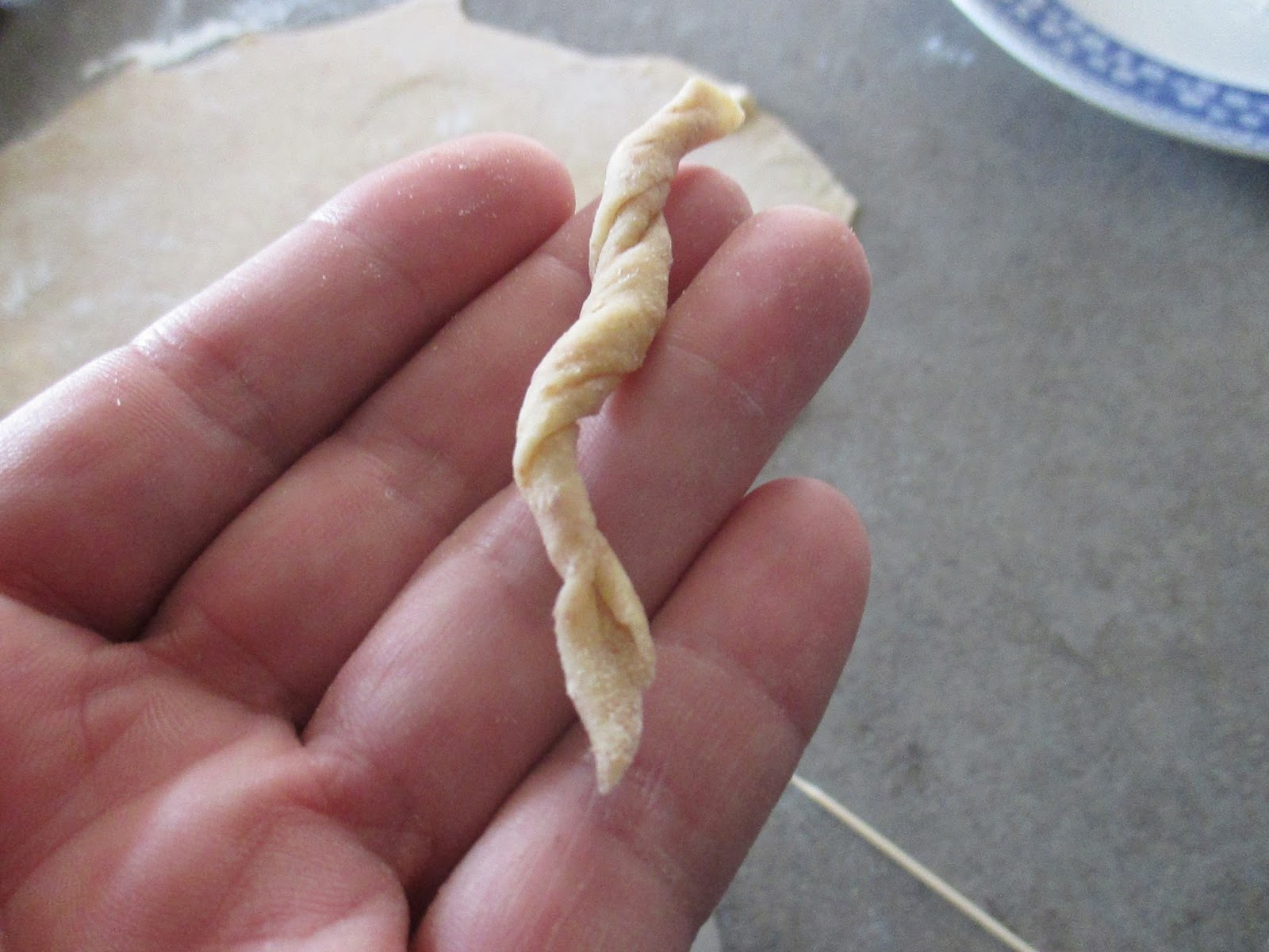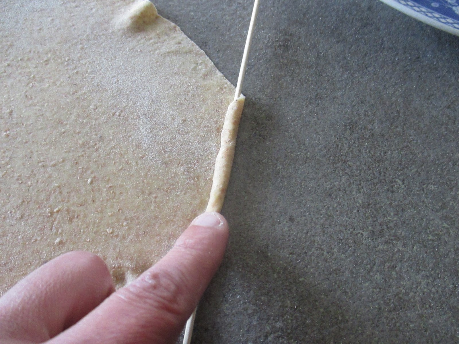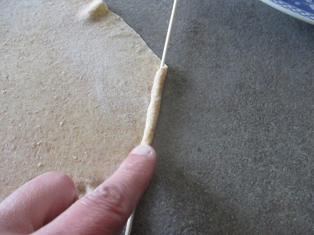 After the interval, finely roll out the dough, then wrap a strip of dough on a stick .