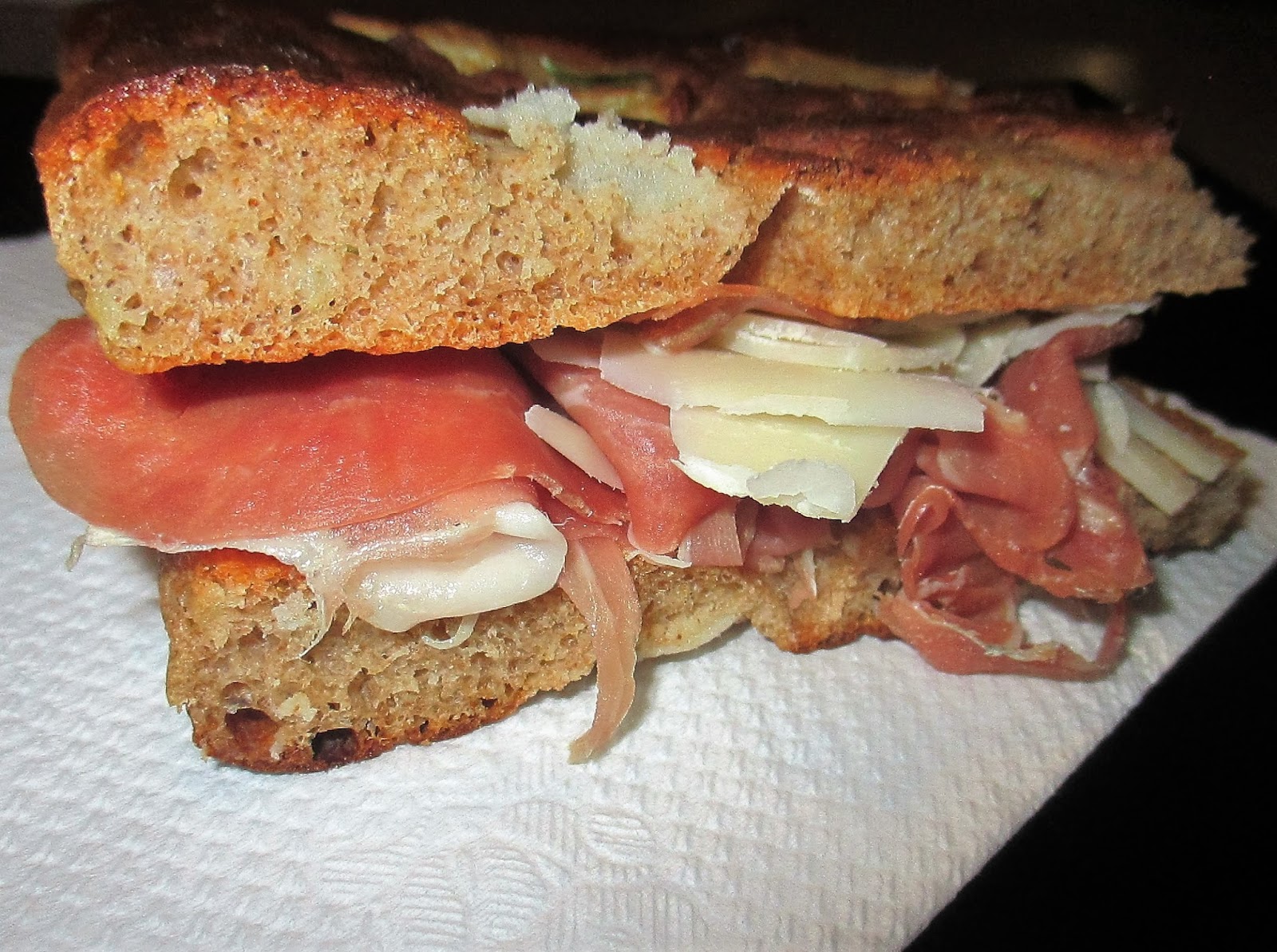 Uno spettacolo veramente questa focaccia di farro integrale con delle patate nell’impasto. L’ho poi imbottita con uno squisitissimo prosciutto crudo San Daniele e del sempre gradito formaggio Parmigiano reggiano. Sublime.