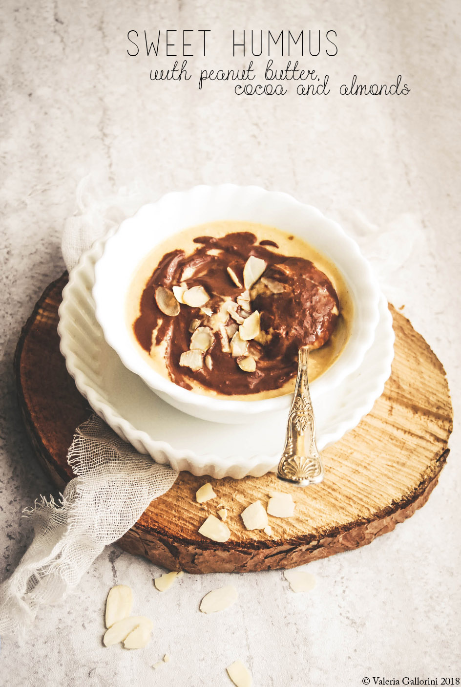 As a great lover of hummus which I am – I made it with beets, peas, broad beans, borlotti, and avocado - I wanted to try this sweet version, with peanut butter, cocoa and almonds.