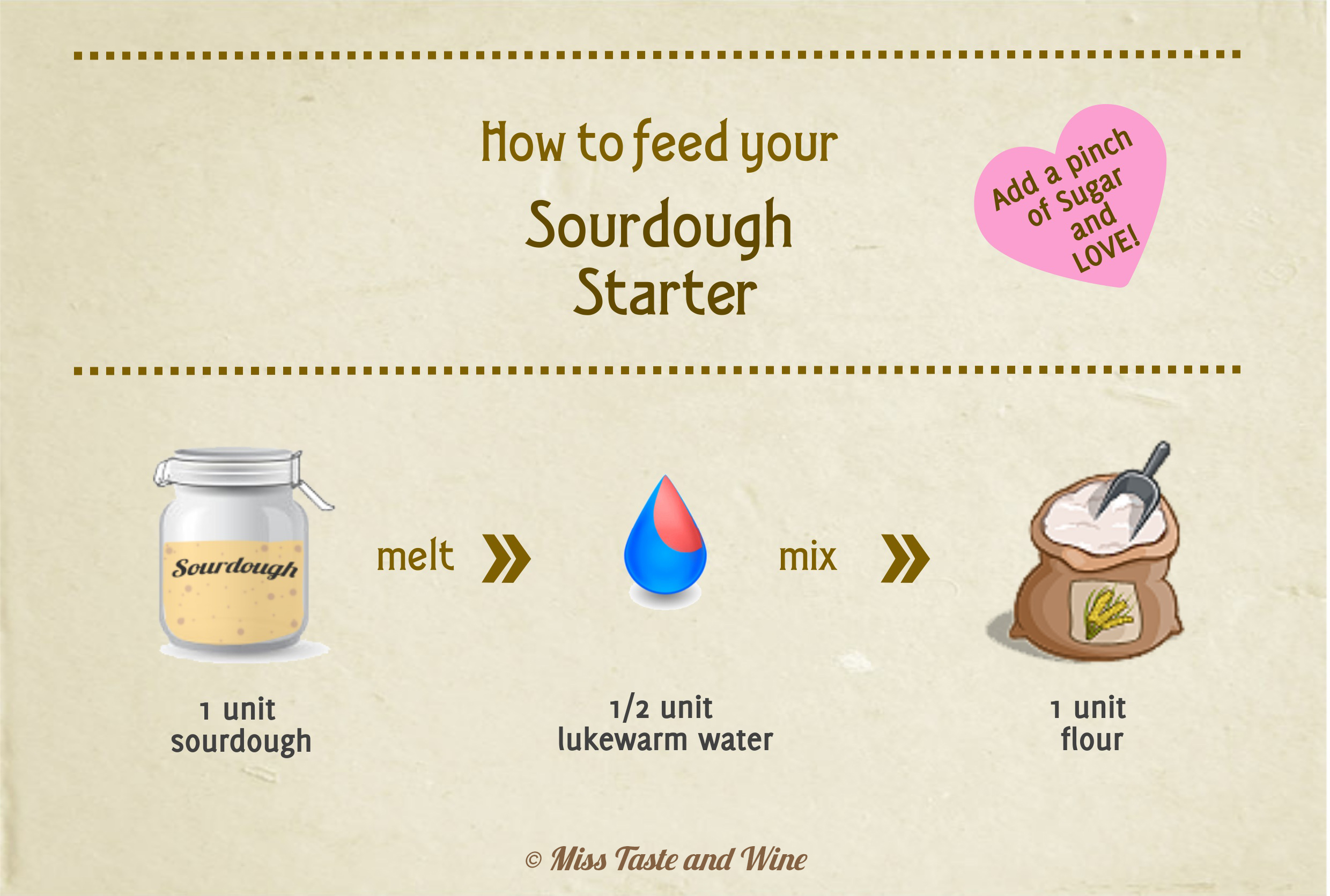 I usually gently melt1 unitof sourdoughinto½ unit of lukewarm water, then mix witha bit of sugarand1 unit of flour. An example: 100 gr. sourdough + 50 gr. water + a pinch of sugar + 100 gr. flour.I keep halfof the resultant doughfor baking, andstore the rest in a jar in my fridgefor future use.