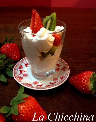 Ora componiamo i nostri bicchierini; nel fondo mettiamo una generosa cucchiaiata di crema, continuiamo con pezzi di fragola e kiwi e ripetiamo l’operazione sino ad esaurimento degli ingredienti.