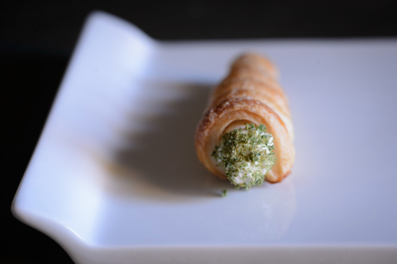 Cannoncino di sfoglia aromatizzata alla vaniglia, con crema namelaka al cardamomo e mela verde, decorato con polvere di mela verde