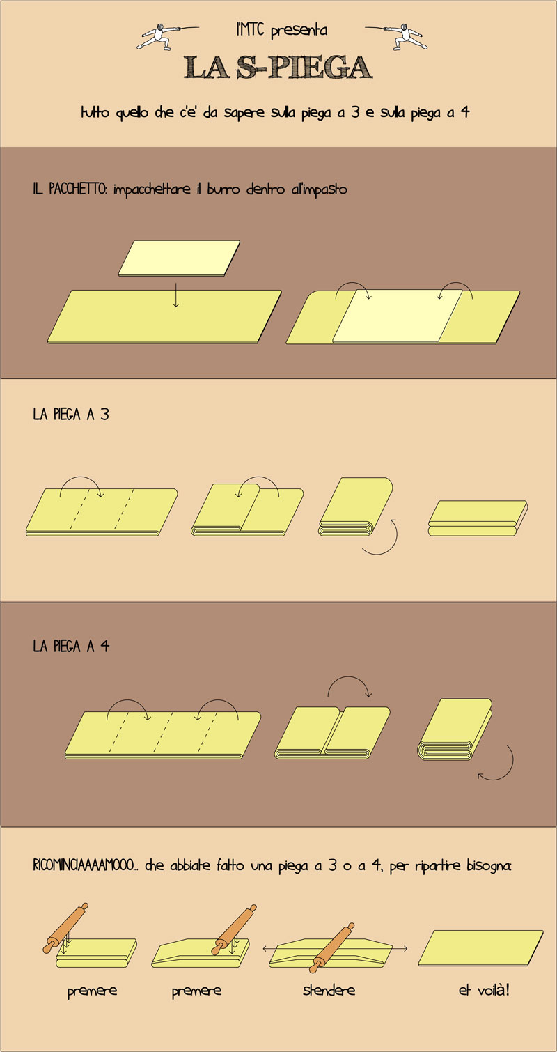 Dopo il riposo, togliere la pellicola, posizionare il panetto di pasta con la chiusura a destra, sigillare sopra e sotto (infografica docet) e stendere fino ad 1 cm di altezza. Eseguire la piega a 3 e rimettere in frigo per 30/40 minuti, avvolto nella pellicola.