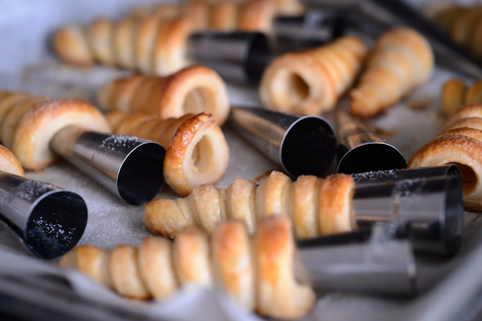 Riprendere la pasta sfoglia e tagliarne un pezzo (è tantissima, per 12 cannoli ne ho usata 1/4). Stenderla ad un spessore di circa 3 mm poi tagliarla in strisce da circa 1,5 cm ed arrotolare ogni striscia su uno stampo da cannoli, via via sovrapponendo leggermente la parte di striscia che stiamo arrotolando, su quella già arrotolata.