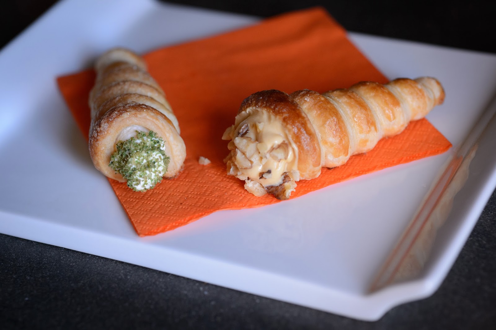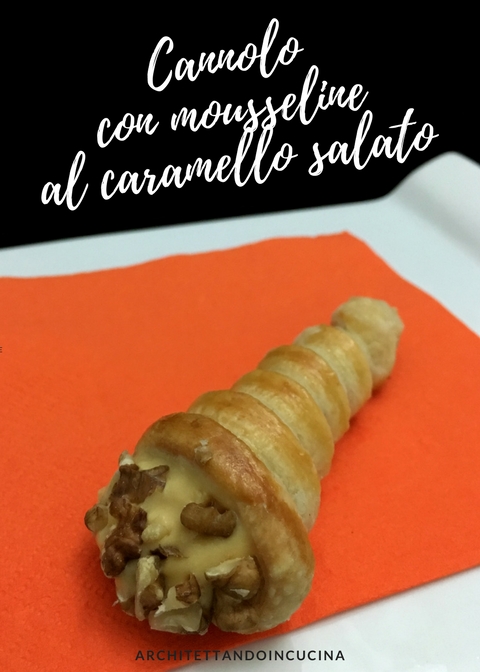 L’altro cannolo, mi è stato ispirato da mio figlio Niccolò ed è a lui che lo dedico. La crema mousseline al caramello salato è la crema per il secondo cannolo, perché anche lui è un ragazzo dolce, morbido e coccoloso, ma solo quando lo decide da solo. E’ capace di incredibili slanci di generosità e tenerezza, ma di solito sta chiuso in una scorza impenetrabile, (leggi cannolo di sfoglia) nel cybermondo, dove noi comuni mortali non abbiamo accesso. Ma proprio come un cannoncino, la scorza è fragile e lascia spesso uscire il ripieno: dolcissimo, ma non stucchevole, con una punta di salinità che rende tutto piacevolissimo. Il contrasto dolce/salato, racconta anche un altro aspetto di mio figlio: è del segno dei gemelli, quindi un po’ doppio sempre. In lui ci sono sempre due persone, due opposti che convivono e che escono fuori alternati senza grande logica. Per enfatizzare questo suo lato, ho unito anche le noci per decorare e per aggiungere l’ulteriore nota croccante e il rivestimento interno di cioccolato fondente. Nella sfoglia del cannolo, ho unito del pepe di Sichuan, per aggiungere una piccola nota aromatica piccante, perché lui può essere molto “pungente”, ironico e sarcastico come fosse un uomo navigato anziché un ragazzo. Insomma avrete capito che Niccolò è la sagra delle contraddizioni, ma nella sostanza un figlio simpatico, una persona gradevole e molto intelligente (si capisce che sono la mamma?) e credo che questo cannoncino lo rappresenti bene.