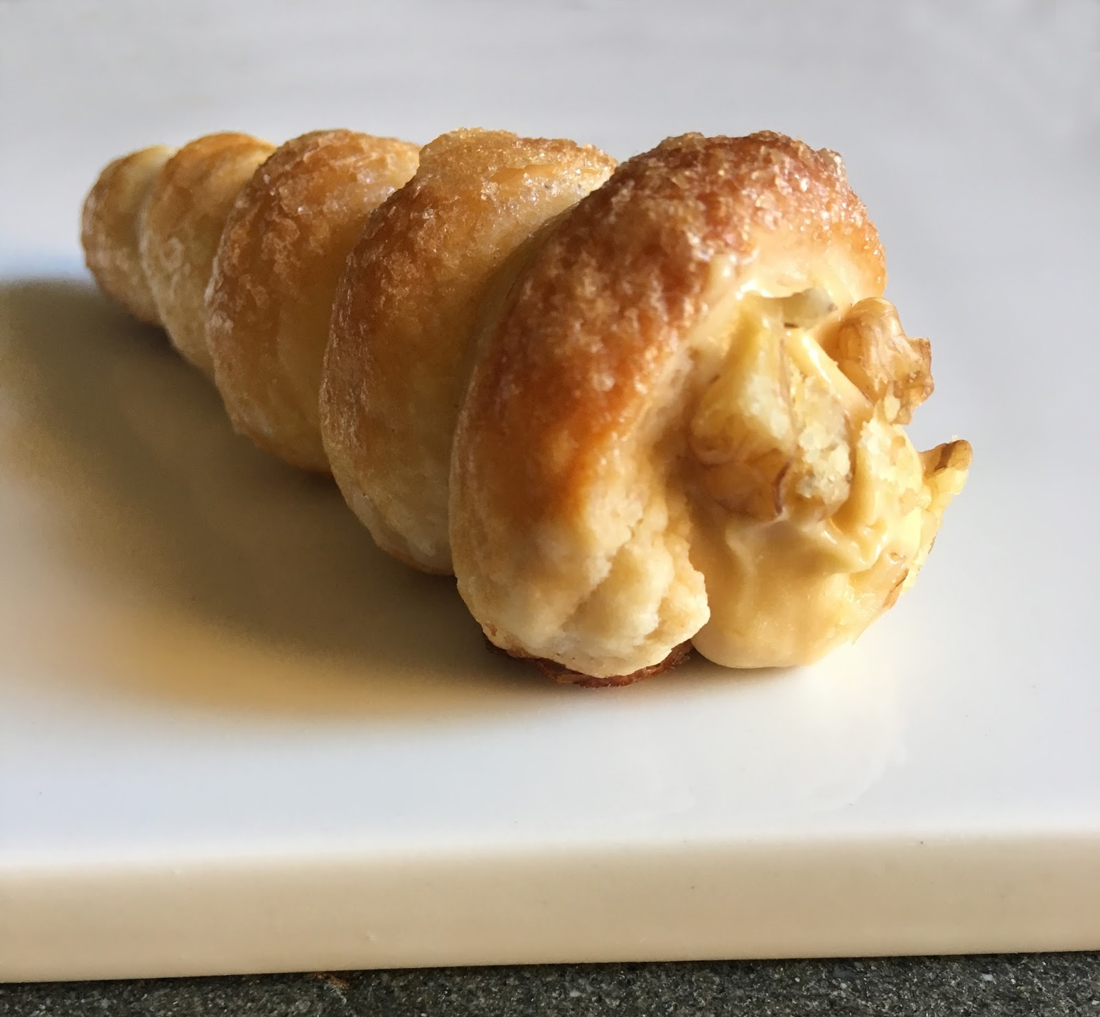 Cannoncino di sfoglia aromatizzata al pepe Sichuan, spennellato internamente di cioccolato fondente, con crema mousseline al caramello salato, decorato con noci Lara appena raccolte