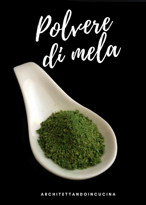 Con il pela patate sbucciare una mela verde, distendere tutte le bucce su un foglio di carta forno ed infornare per 3 o 4 ore a 50°. Devono essere essiccate benissimo. Le bucce devono diventare dure. Tagliarle poi con il coltello molto molto finemente, fino a ridurle in polvere. Se sono molte possono essere tagliate con il mixer, ma se sono poche serve il coltello.