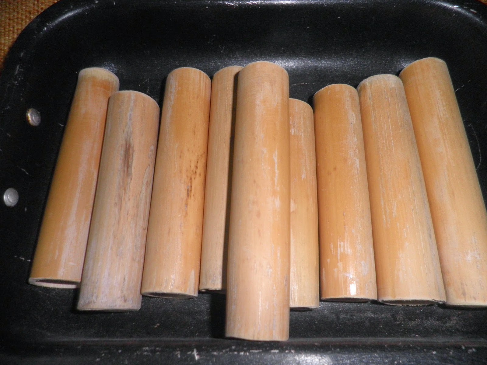 In commercio si trovano i cilindri di metallo per realizzare i cannoli; io invece userò quelli tradizionali, ricavati da una grossa canna che mio marito ha tagliato in pezzi di 12 cm circa.