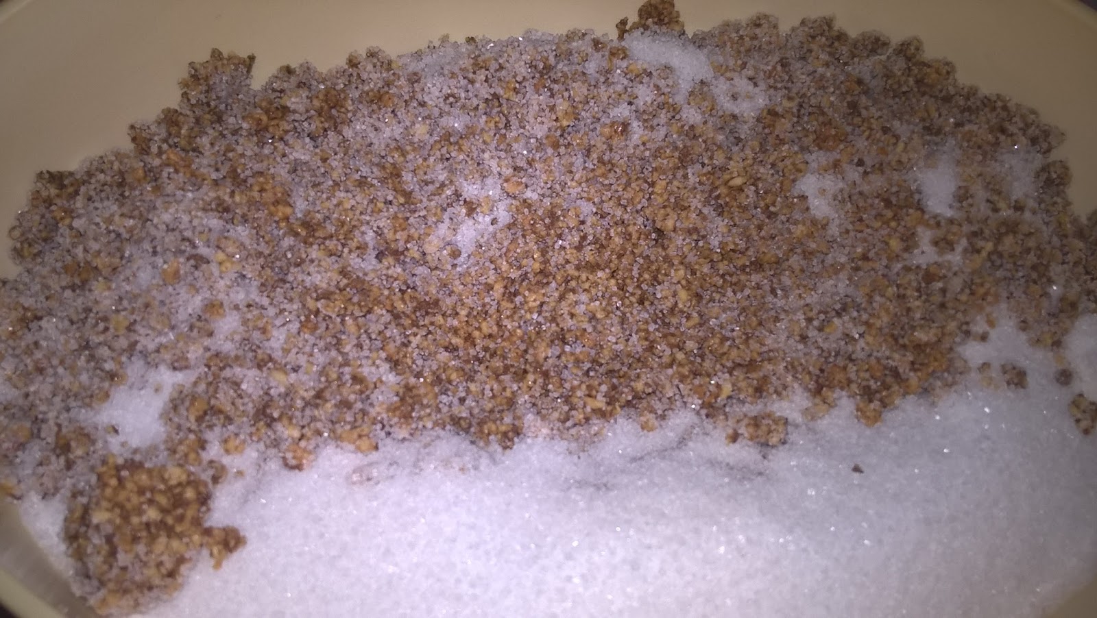 “kg 1 di mandorla abbrustolita, Kg 1 di zucchero, Kg 1 di farina 00, g 100 di cacao, 3 uova, cannella;
