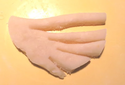 Con un coltello affilato praticare dei tagli, il primo più lungo per formare il collo e gli altri più corti come appare in foto per ricreare l’idea del piumaggio…