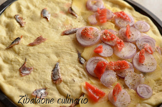 Dividere a metà l’impasto, metterlo sulla teglia e stenderlo piuttosto sottile: distribuire sulla pasta spianata i pezzettini di acciuga spingendoli col dito nella pasta.