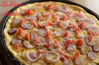 Aggiungere uno o due strati di fette di patate, poi tanta cipolla strizzata bene per evitare di bagnare la pasta, il pomodoro pelato , una spolverata di pecorino e origano, condire con un filo di olio.