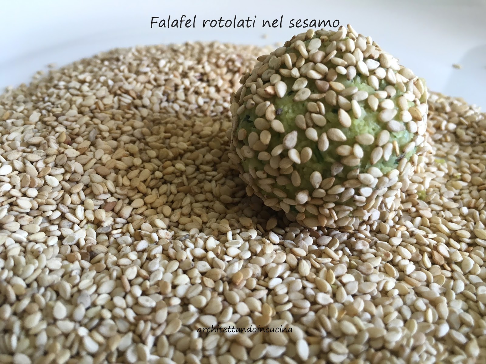 Rotolare le palline nel sesamo bianco (non in modo molto uniforme).