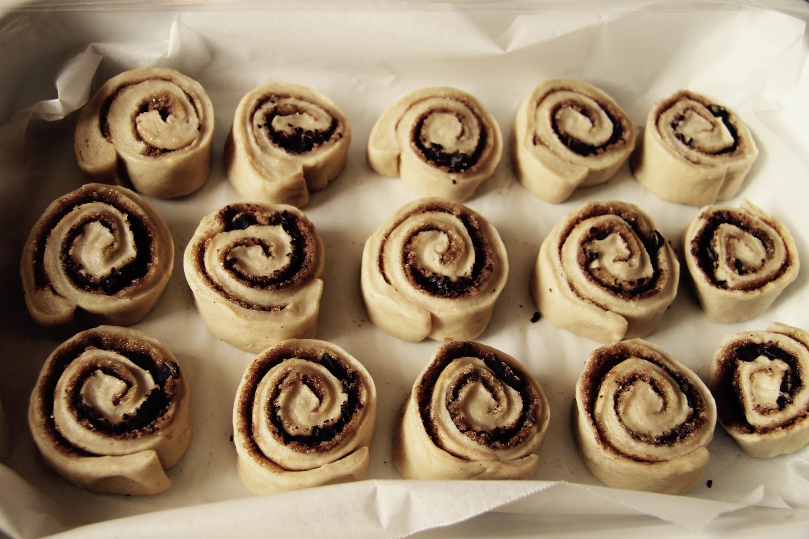 Cominciando dal lato lungo, arrotolate l’impasto per ottenere un cilindro, premendo delicatamente con le mani per tenerlo insieme. Con la chiusura rivolta verso il basso, tagliate il cilindro di traverso per ottenere cirrca 35-40 girelle.