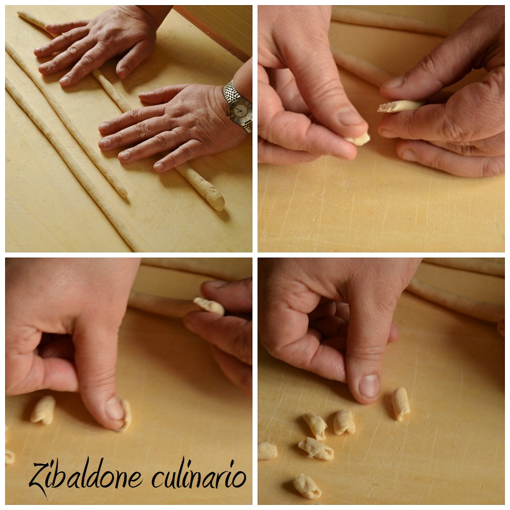 Procedere facendo dei piccoli cordoncini di pasta dal diametro di 5mm, assottigliandoli con i palmi delle mani; da questi sottili cilindri, staccare dei pezzetti con le mani e con il pollice modellare a gnocchetto.