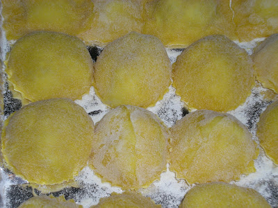 Fare la pasta fresca con il procedimento già descritto in altre ricette , quando sarà molto sottile e trasparente cominciare a posizionare il ripieno su di un lato della pasta , avendo cura che tra un mucchietto e l’ altro ci sia la distanza di 2 dita . Questo ci sarà utile quando sovrapponiamo un secondo strato di pasta sopra al ripieno e con le dita schiacciamo bene intorno per non lasciare aria . Prendiamo un taglia ravioli , ne esistono di tante forme , quadrati , rettangolari , a stella o tondi Centrate il ripieno sigillando con il taglio i bordi