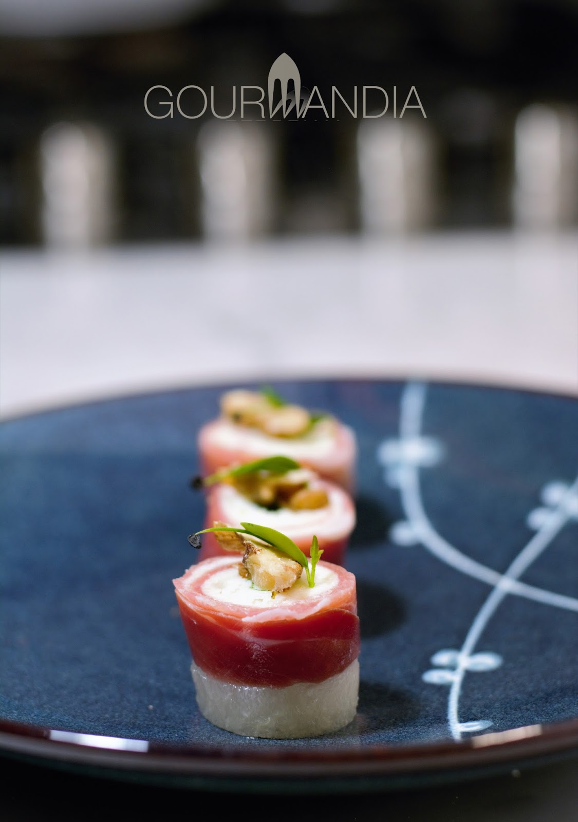 2- Roller di prosciutto crudo, crema di mascarpone e rucola su base di melone bianco