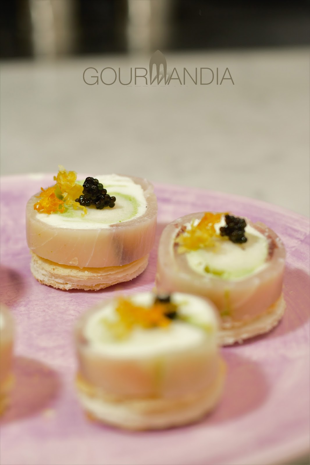 1 – Roller di pesce spada, crema di asparagi e cuore di baccalà su base di brisé