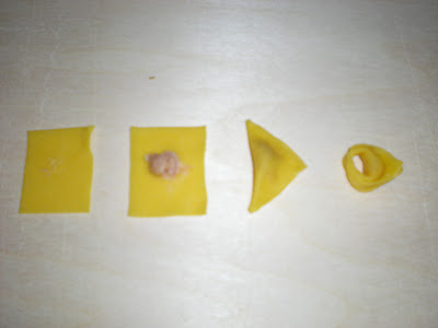 6-Va poi tagliata aiutandovi o con la rotella o con l’apposito arnese dei quadrati di 3 cm.Il vero tortellino è abbastanza piccolo. E’ importante evitare di infarinare la sfoglia al termine della sua preparazione, altrimenti non si attacca quando viene ripiegata per racchiudere il ripieno.