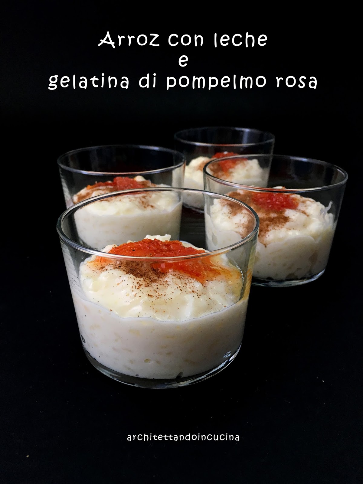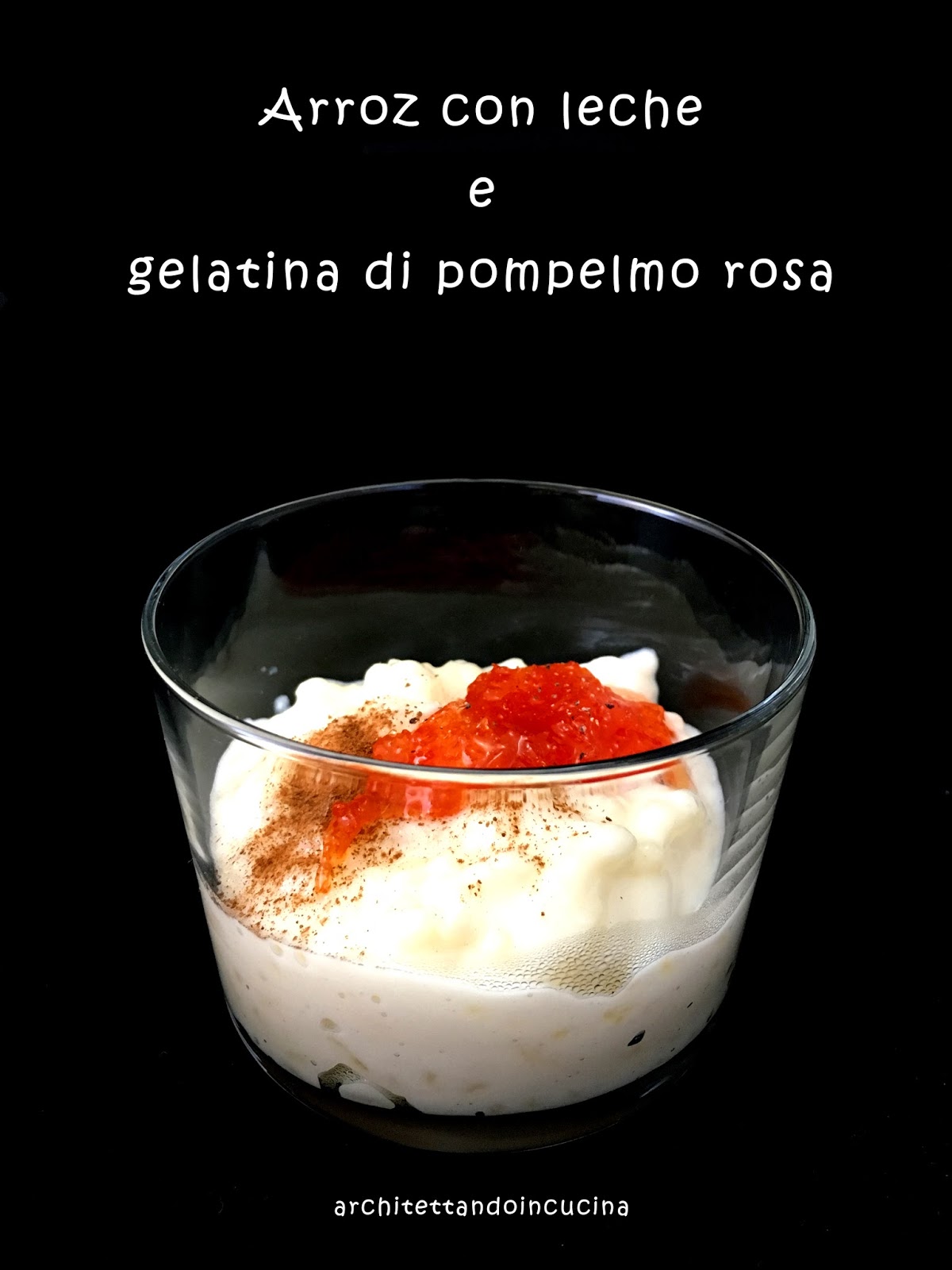 Mettere a bagno il riso per 2 ore nel latte in modo che perda l’amido. Cuocere a fuoco basso, finchè il riso non è diventato tenero, insieme alla scorza di limone. A questo punto aggiungere lo zucchero e far cuocere ancora alcuni minuti. Alla fine la preparazione deve essere spessa e cremosa, ed il riso cotto. Far raffreddare e comporre in ciotoline monoporzione cosparse con un po’ di cannella. Aggiungere un cucchiaio di gelatina di pompelmo rosa e un pizzico di pepe nero appena macinato