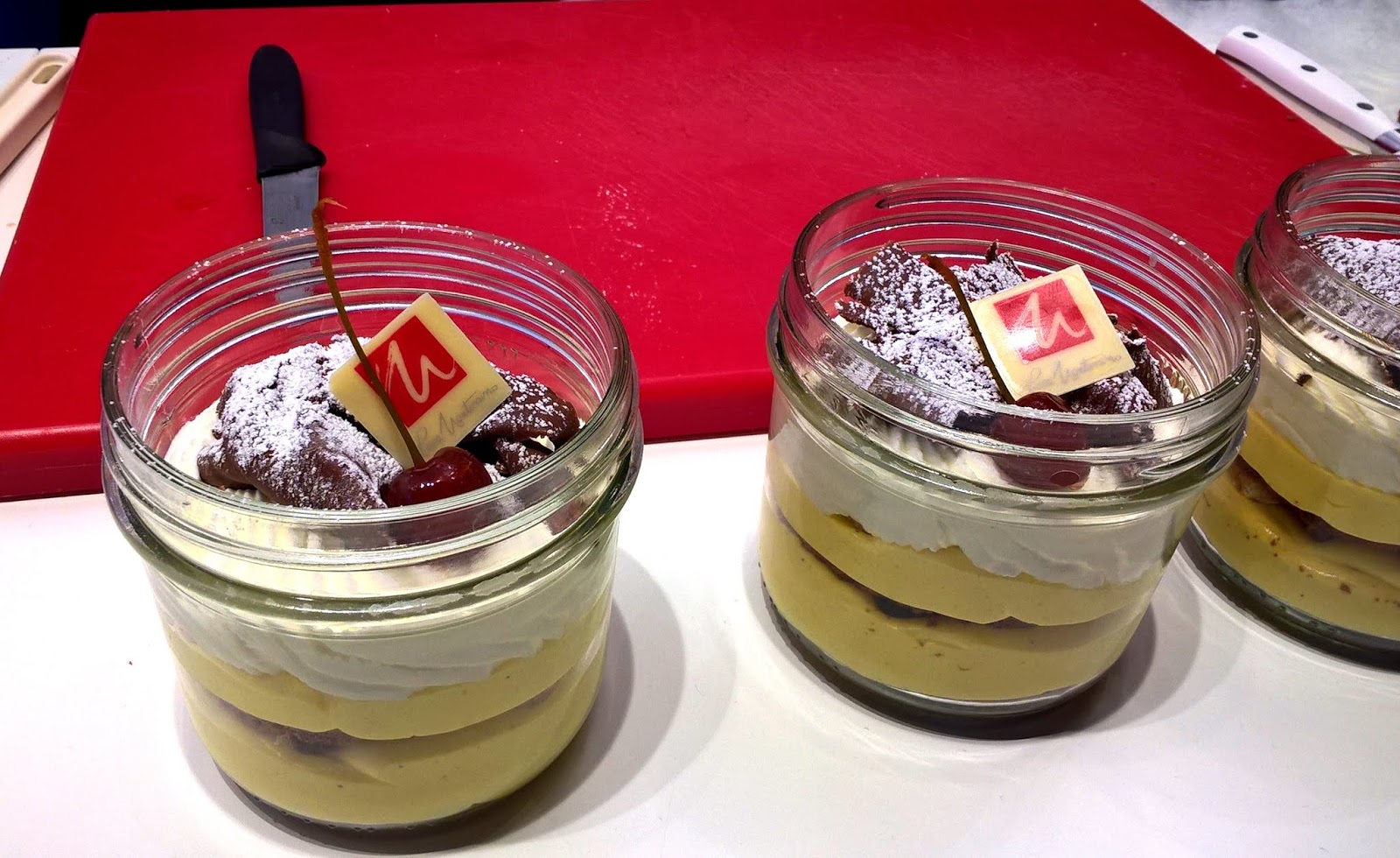 Nei giorni successivi ha poi eseguito la Torta Zurigo in vasetto, composta da dischetti di Sablè breton al cacao, chantilly, granella di torrone, ciliegie sotto spirito e sfoglie di gianduia. Assaggiata anche questa… beh! Che dire?… Slurp!