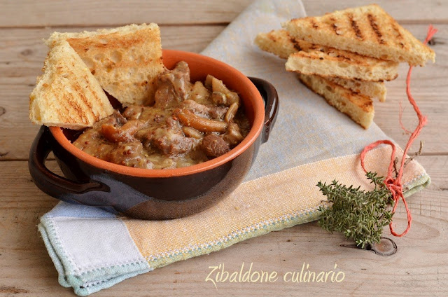 Servire lo spezzatino di funghi e carne con pane tostato tal quale o aromatizzato all’aglio.