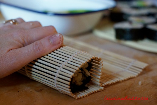 Insomma seguendo le istruzioni ne ho fatti alcuni con la macchinetta, altri a mano con la stuoina, bagnandomi sempre le mani con acqua acidula prima di prendere il riso e questo esperimento mi ha veramente galvanizzata, si dice?!?!