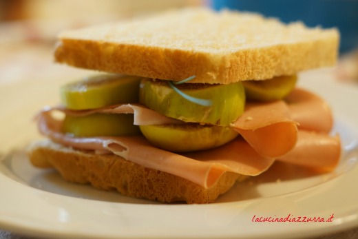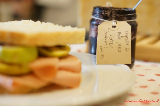 - Una volta freddo tagliatelo a fette e farcite: io ho messo mortadella, fichi del mio orticello e questa mostarda alle mele e more che preparai lo scorso anno….deliziosa. Aggiungete qualche filo di erba cipollina ci sta sempre bene.