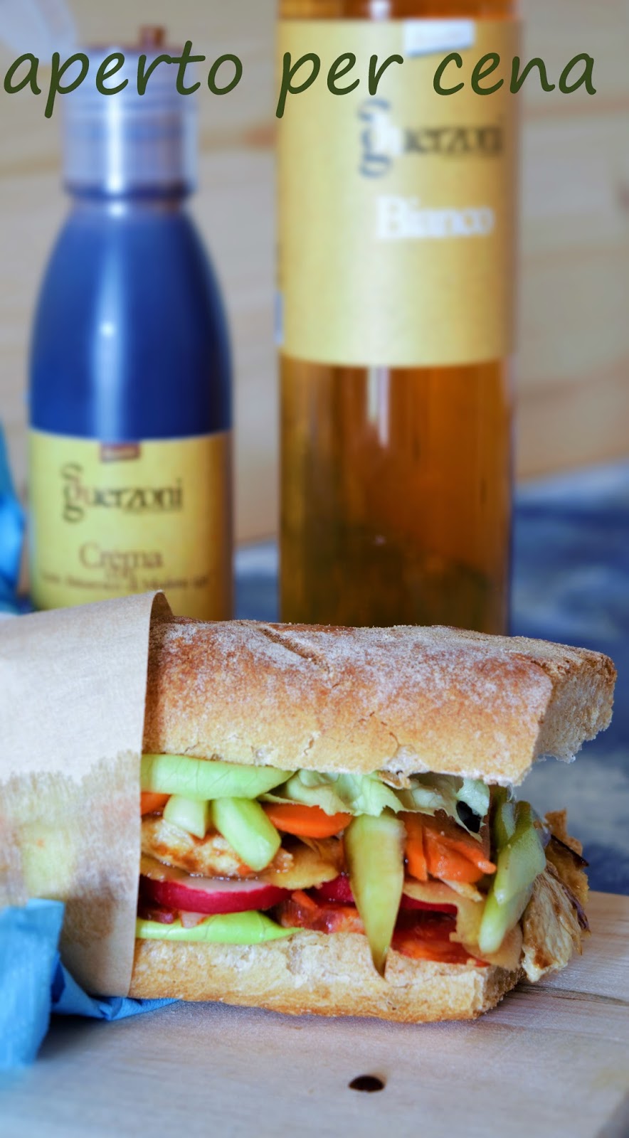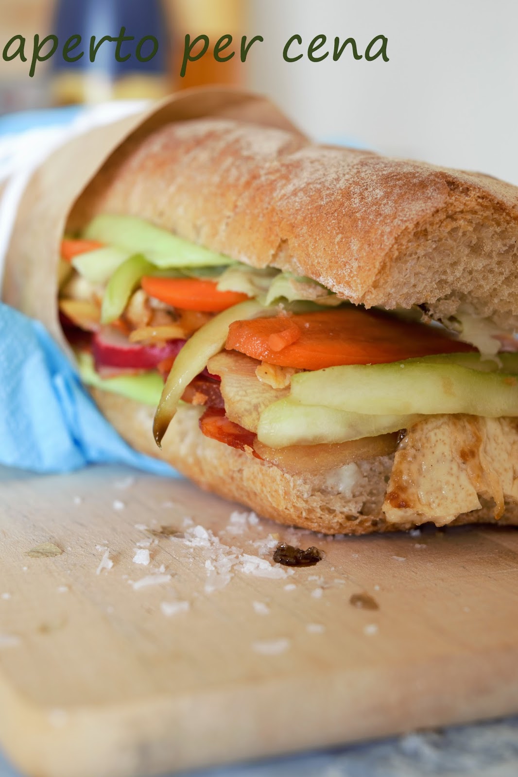 Affettiamo: carota e cetriolo già pelati, cipollotto, ravanelli e ricopriamo il tutto con la marinata di zucchero, olio, pepe e condimento bianco ben mescolati, lasciamo insaporire per 30 minuti. Trascorso il tempo, scoliamo dalla marinatura e farciamo la baguette.