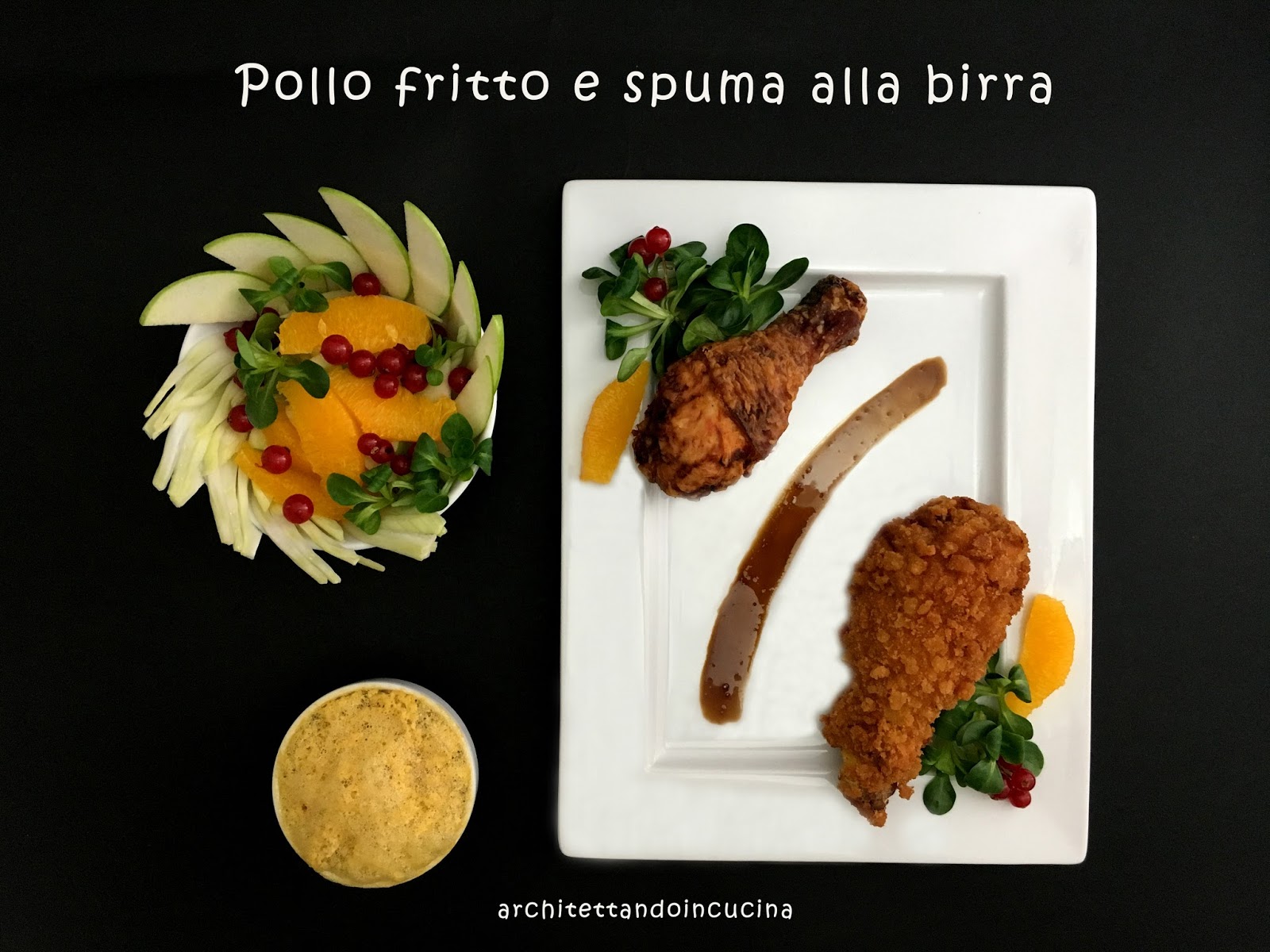 Ho fatto prove su prove, poi ho deciso usi multipli per questa birra: infatti ho notato che nella marinatura rilascia tutti gli aromi del tartufo, mentre nella riduzione, l’ebollizione li fa perdere quasi totalmente ed accentua tutte le note aromatiche ed amare della birra, mentre nella spuma si esaltano sia le note aromatiche della birra che quelle del tartufo. Accompagno il fritto e le salse con una freschissima insalata di finocchi, arance, mele verdi e ribes, che daranno una nota acida e rinfrescante che mancava nel piatto.