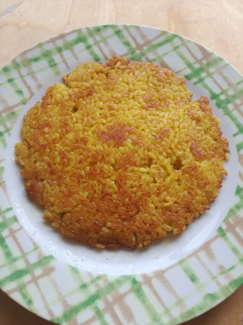 Accendete il fuoco, non troppo alto mi raccomando, ma non toccate fino a quando non si sarà fatta una bella crosta dorata e croccante. Può accadere che il riso non si compatti o che se lo tocca eccessivamente si spossa rompere. Per questo è importante che il riso abbia riposato, perchè poi ci penserà l’amido stesso del riso a rimettere tutto a posto. Un pò come succede per gli arancini siciliani (a proposito, volete la ricetta?).