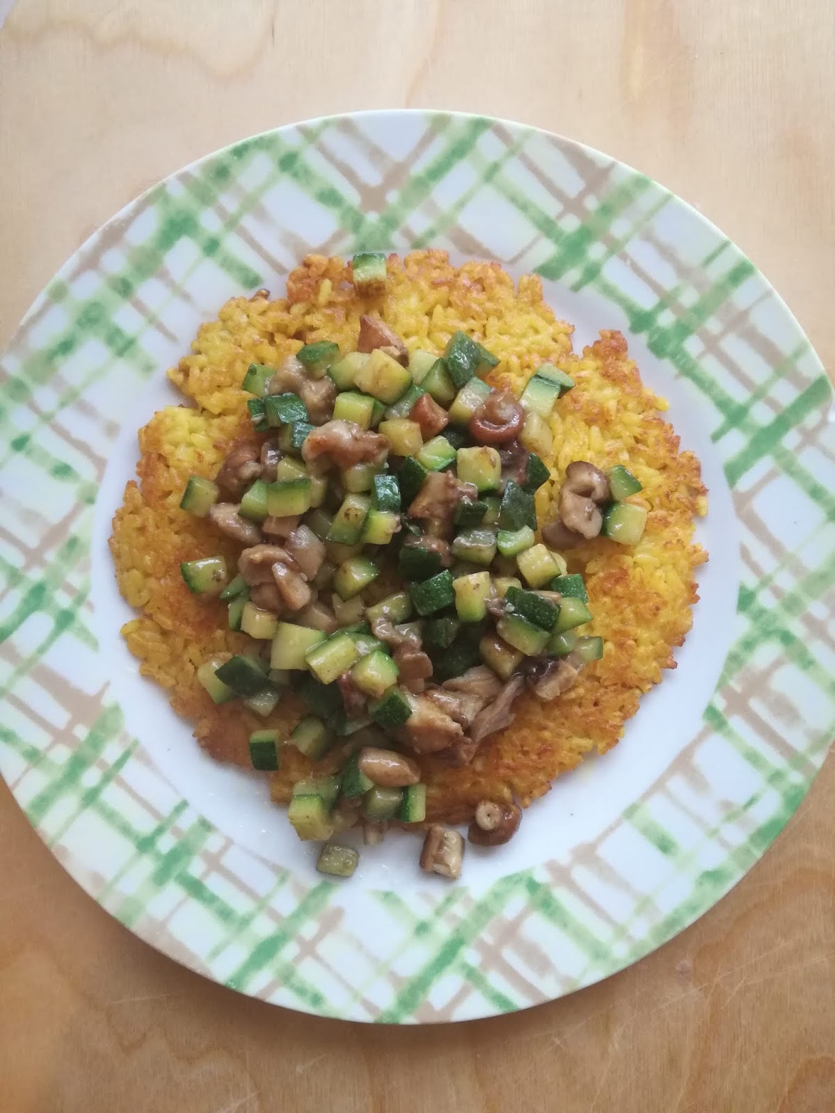 Io ho cominciato dal “topping”, quindi ho lavato e tagliato a cubetti la zucchina, e l’ho messa a rosolare in una padella con aglio, olio e timo. Una volta che le zucchine si sono ammorbidite le ho messe da parte e nella stessa padella ho trifolato i funghi. Io ho usato un mix di funghi surgelati, ma ci si può mettere quello che uno preferisce. Una volta cotti, ho riunito le zucchine e i funghi, ho salato e pepato, ed ho rimesso da parte. Nella medesima padella, che deve necessariamente essere super ANTIADERENTE, ho messo un altro goccino di olio, e ho versato il riso. Per le quantità non ci sono dosi, andate ad occhio sulla base del diametro della padella, e anche di quanto vi piace sottile o spesso il riso al salto. Bagnate il dorso di un cucchiaio, oppure usate le dita delle mani bagnate, e livellate il riso spargendolo per tutto il fondo della padella.