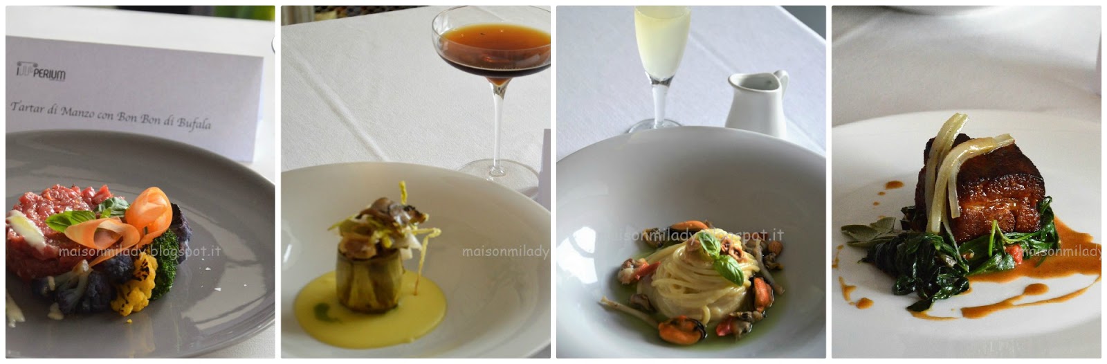 I piatti presenti nel menù del locale, ideati dallo chef consulente Vincenzo Langella, rispecchiano gusti e abitudini degli italiani. Un esempio è lo “Spaghettone cacio e pepe su guazzetto di frutti di mare e pesto di nocciole”, l’incontro tra due piatti tipici di due regioni italiane (il Lazio e la Campania): la pasta cacio e pepe e gli spaghetti con i frutti di mare; il tutto accompagnato da un cicchetto di “French 75”, un cocktail a base di gin, succo di limone, sciroppo di zucchero e vino bianco. Eh si, perché da Imperium – oltre che ai vini – è possibile abbinare ogni piatto ad un cocktail. Così, ad esempio, alla tartare di manzo con bon bon di bufala è possibile accostare un “Passion Apple” (fatto con liquore di mele, sciroppo passion fruit, succo di mandarino , succo limone e succo di mela verde), oppure a un boccone di stracotto di maiale alla soia e miele con bieta e rucola selvatica si può alternare un sorso di “Dolceamaro” (ottenuto con lime, rucola prestata, sciroppo di agave, zenzero pestato, vodka e ginger ale). I cocktail sono frutto della creatività di tre giovani bar tender che si alternano dalla mattina fino a tarda notte al bancone di Imperium per garantire agli ospiti esperienze di food pairing in qualsiasi momento della giornata: Ivan Cerbone, Rosario Marciano e Sandro Azam.