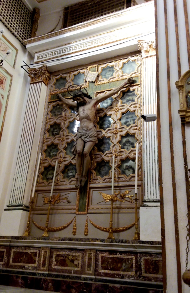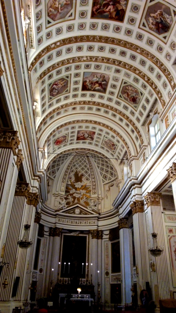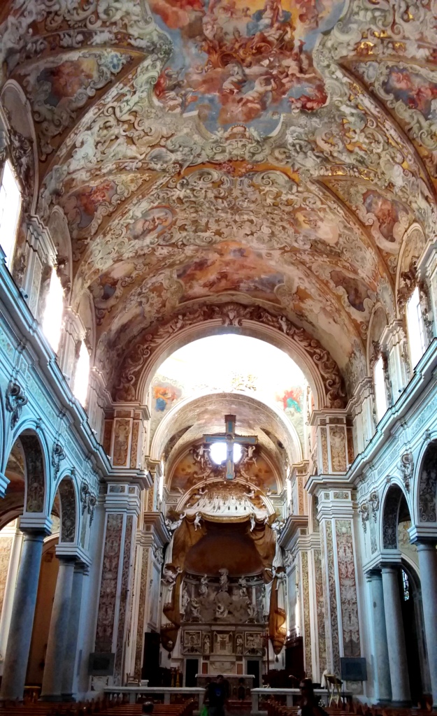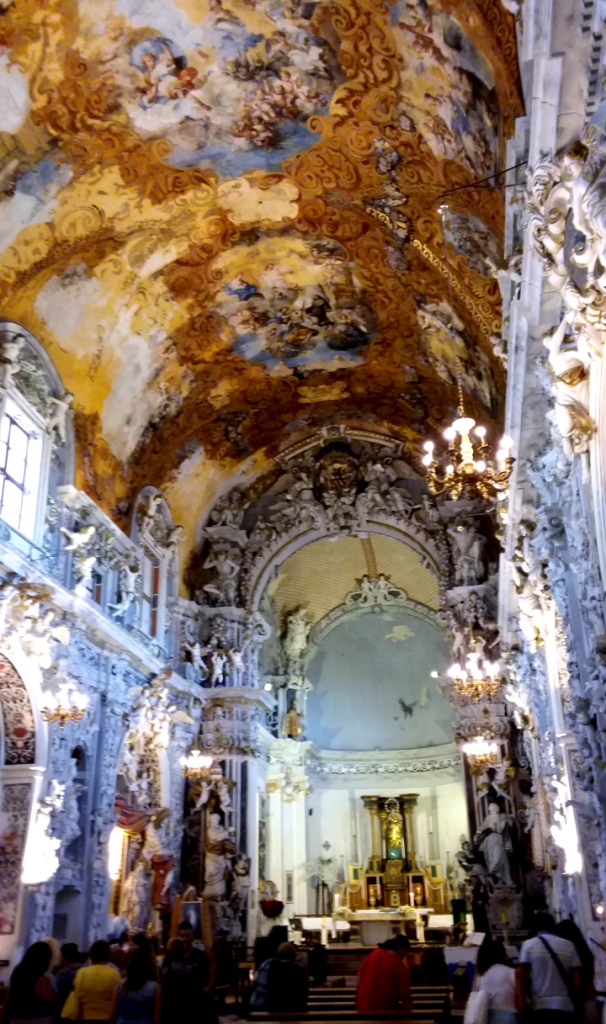 S’è fatta quasi ora di cena e stiamo tornando all’auto, quando notiamo un gruppo di persone che escono da una Chiesa dalla facciata austera e quasi insignificante. Incuriositi decidiamo di entrarvi e veniamo subito accolti da un monaco simpatico ed esuberante che con fervore ci invita alla visita. Ricorda quasi un “buttadentro” dei nostri locali estivi! Accettiamo volentieri, anche perchè merita. Entrando si rimane senza fiato, tanta è la bellezza! Si tratta della Chiesa di San Francesco d’Assisi fatta erigere verso la fine dell’XI secolo dal Conte Ruggero d’Altavìlla e quasi interamente ricostruita in stile barocco nel 1680. Il soffitto è tutto decorato, per non parlare delle pareti che sono un tripudio di statue, fregi, stucchi, bassorilievi e intarsi che ne coprono ogni centimetro quadrato. L’intraprendente frate ci porta anche nella cripta e ci illustra tutto con grande entusiasmo, definendo la basilica “best in the world”.